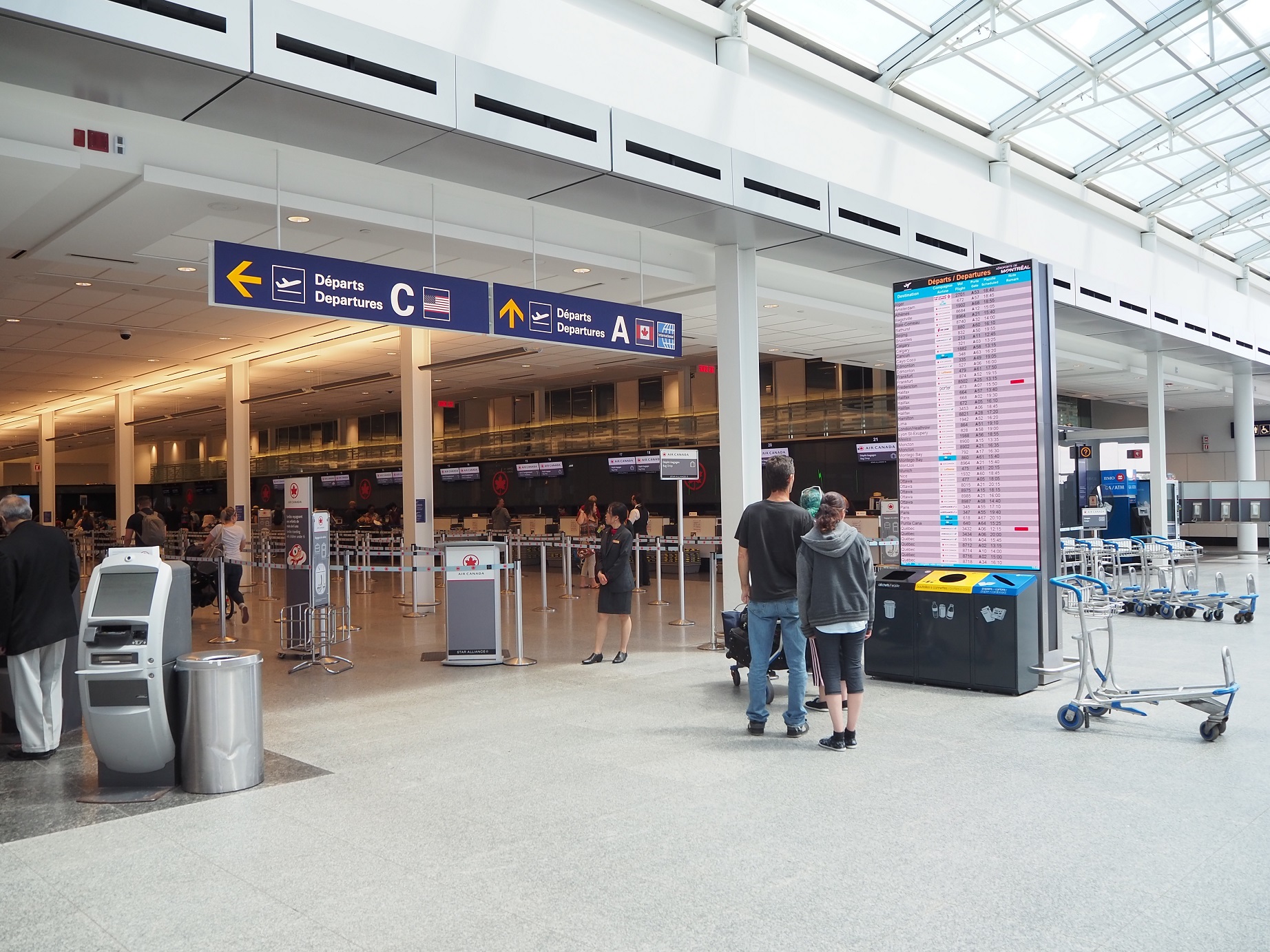 CRJ900は定刻の午後0時5分に到着した。だが、乗り継ぐ便の出発まで1時間しかない。カナダは英語とフランス語の両方が公用語だが、モントリオールがあるケベック州では看板にフランス語が優先して表記されている。フランス語で乗り継ぎを意味する「CORRESPONDANCES」と記したカナダ国内線の乗り継ぎ便への通路を示す矢印をたどった。