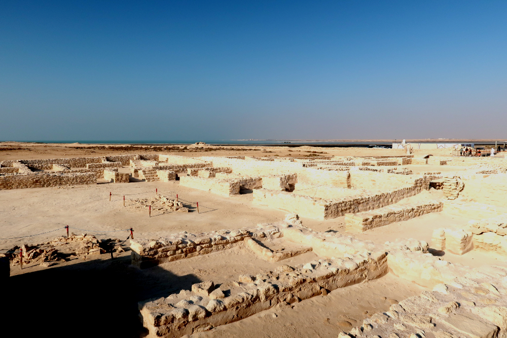 かつて宮殿やモスク、漁師小屋などもあった街は紛争により破壊され、大部分が砂の下に。遠くに見えるのが、バーレーン湾。