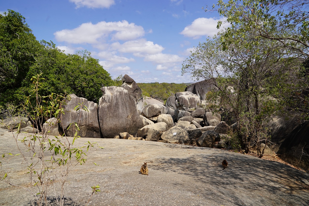 ワラビーに会える「グラナイト・コージ・ネイチャーパーク」はキャンプ場も併設された、見わたす限りのアウトバック。ごつごつした灰色のかこう岩の渓谷から、体長50㎝くらいのかわいいワラビーたちが、ひょこひょこ出てきます。
