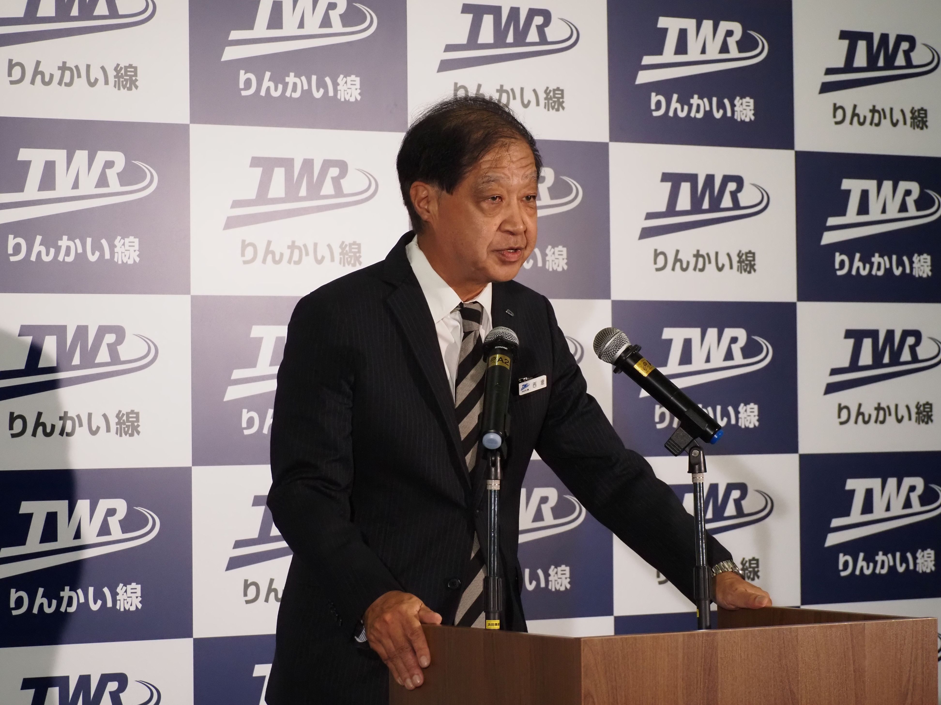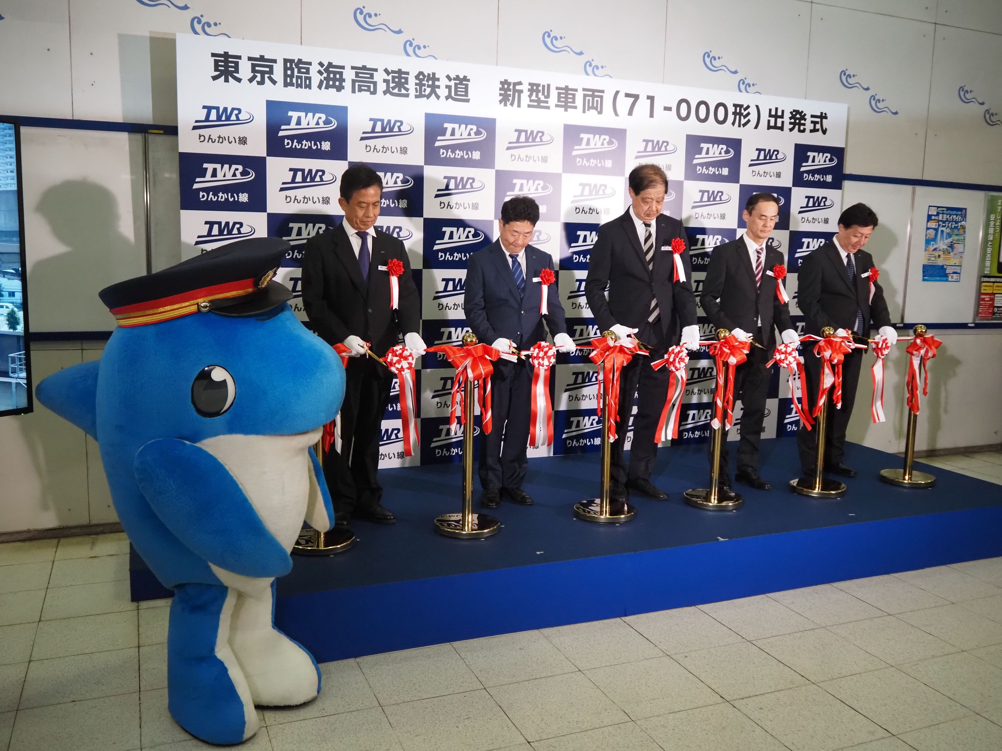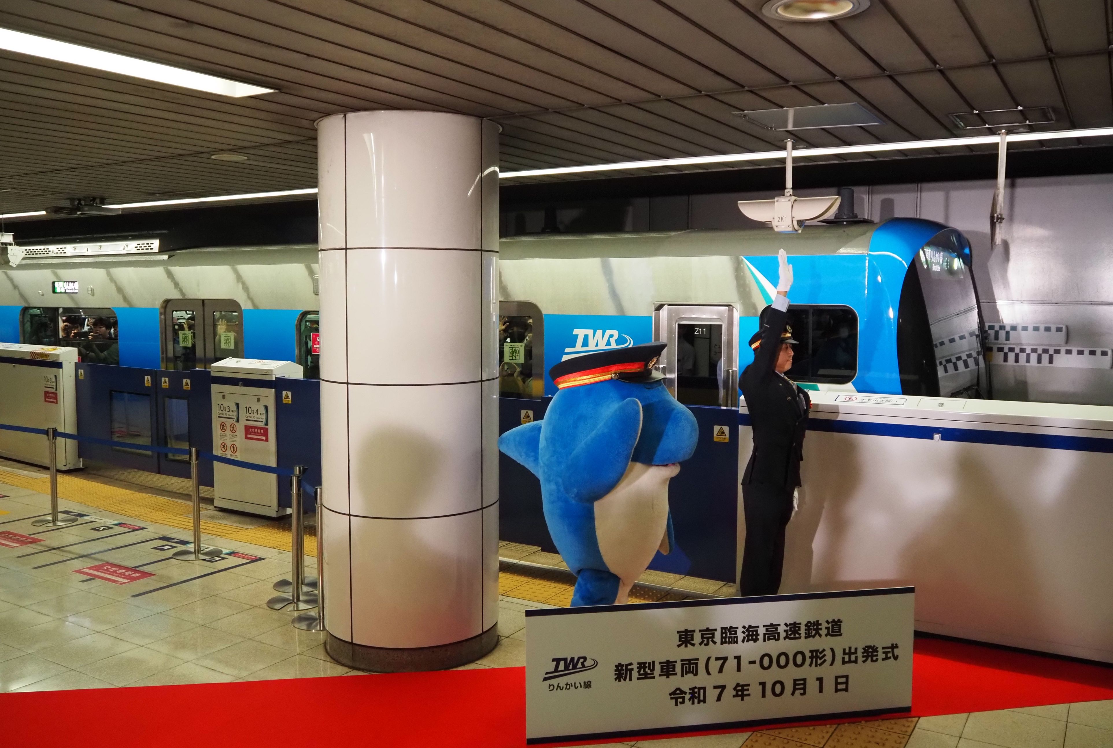 一番列車の発車に先駆けて東京テレポート駅構内で実施された出発式で、東京臨海高速鉄道の西倉鉄也社長は初めての“世代交代”となる71―000形の運行開始がりんかい線にとって「まさに新たなステージを象徴するものになる」と強調した。