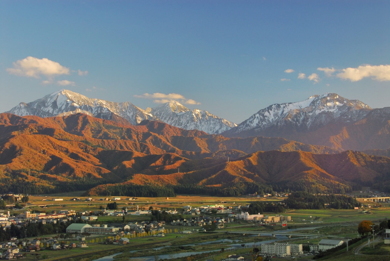 - 黄金色に染まる魚沼の秋、越後三山を望む風景©魚沼市観光協会