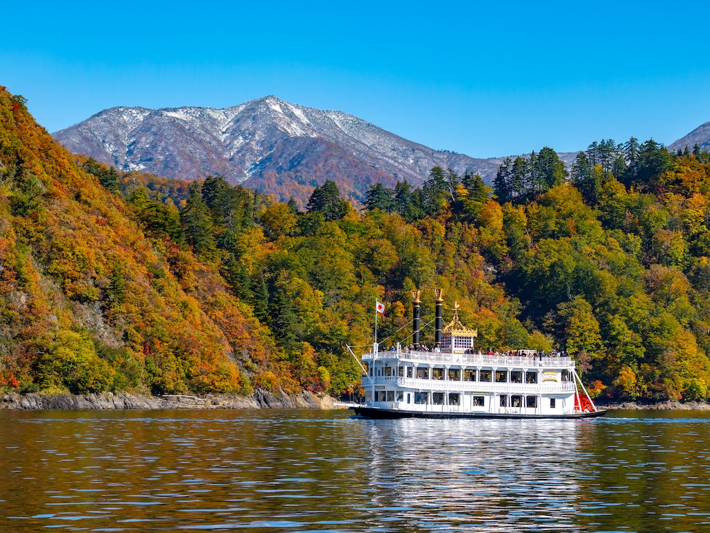 今回は奥只見乗船場から銀山平乗船場までの40分コースに乗船した。視界に入ってくるのは、会津駒ヶ岳、燧ヶ岳、平ヶ岳、越後三山など2000m級の名だたる山々と原生林の紅葉。デッキに立つと、澄んだ空気が心地よく、風とともに秋の気配を肌で感じられる。紅葉の見頃は10月下旬から11月上旬。2025年の遊覧は11月8日まで運航されている。