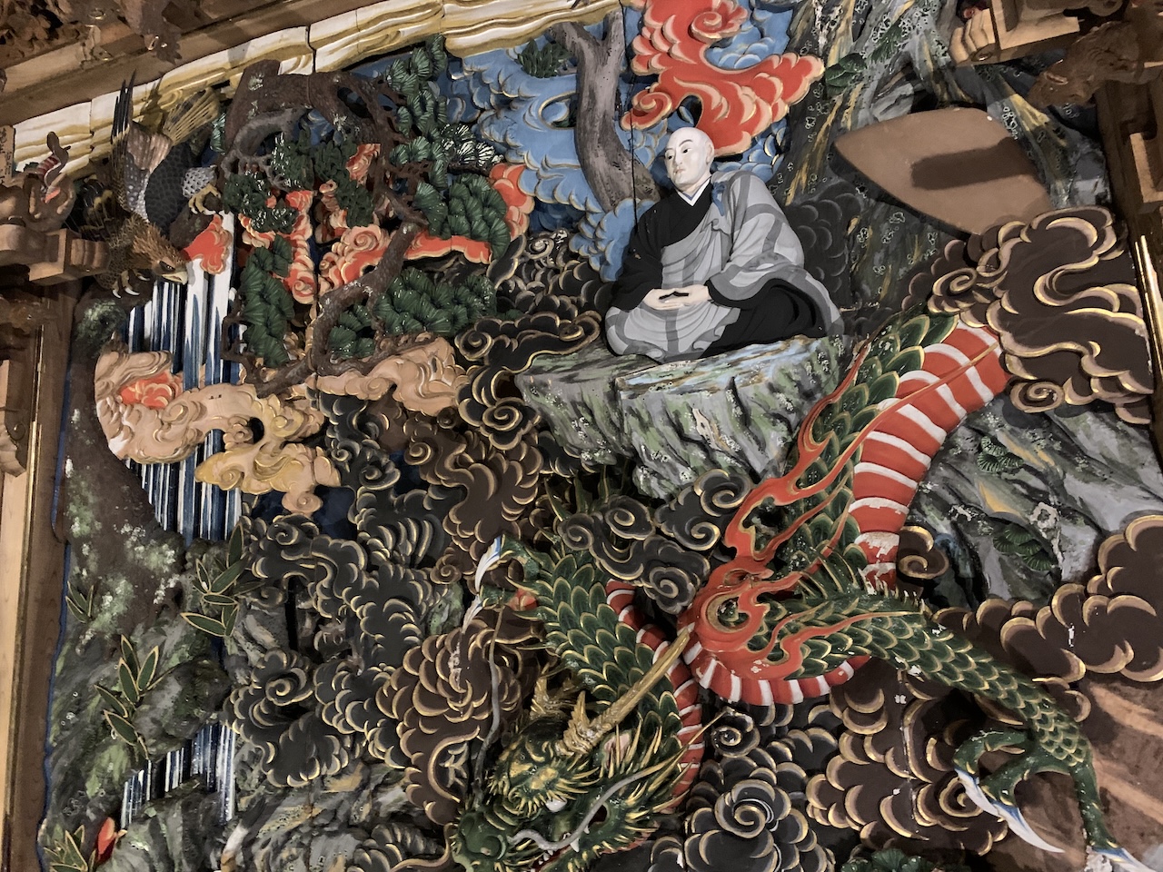 - 代表作「道元禅師猛虎調伏の図」は、西福寺開山堂(新潟県魚沼市)の天井一面を覆う大作で、魚沼市を代表する観光スポットのひとつでもある。木肌に極彩色を施し、龍が天へ昇るような迫力と透かし彫りの繊細な表現力で訪れる人を圧倒する。制作以来150年以上、一度も本格的な修復を行っていないとされるが、今も龍の目が光を反射し、色彩が鮮やかに残る。雪国特有の湿度と、人々の丁寧な管理によって守られてきた“奇跡の保存”だ。