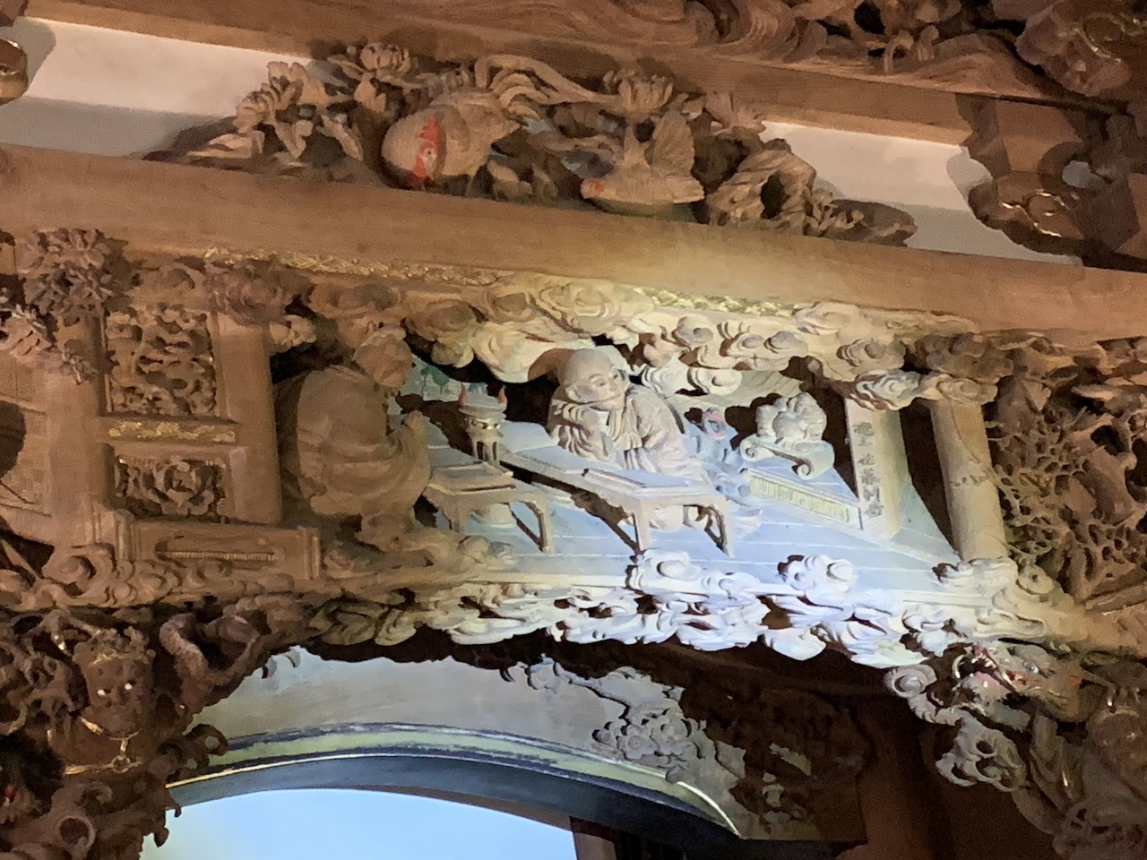 - 原木から切り出した一枚板を立体的に掘り上げる、雲蝶の技の核心はそこにある。木・漆喰・彩色・金属・ガラスなど異素材を組み合わせる立体芸術でリアルさを追求した雲蝶は、単に木を彫るだけでなく、彫刻に命を吹き込んだ。龍の目には内側からギヤマン(ガラス玉)をはめ込んで、まるで本物の眼のように見せる技法により玉眼がはめ込まれ、光を受けると生きているかのように輝く。また、堂内の柱には見る角度で表情が変わる幽霊の彫刻がある。正面から見ると穏やかな女性の姿、しかし少し角度を変えると、顔の半分が陰になり、悲しみや怨念を宿したように見える。雲蝶が表現したのは、人の心の二面性、そして“生と死のあわい”だったのかもしれない。訪れた際には、左手奥の柱をそっと覗き込んでみてほしい。