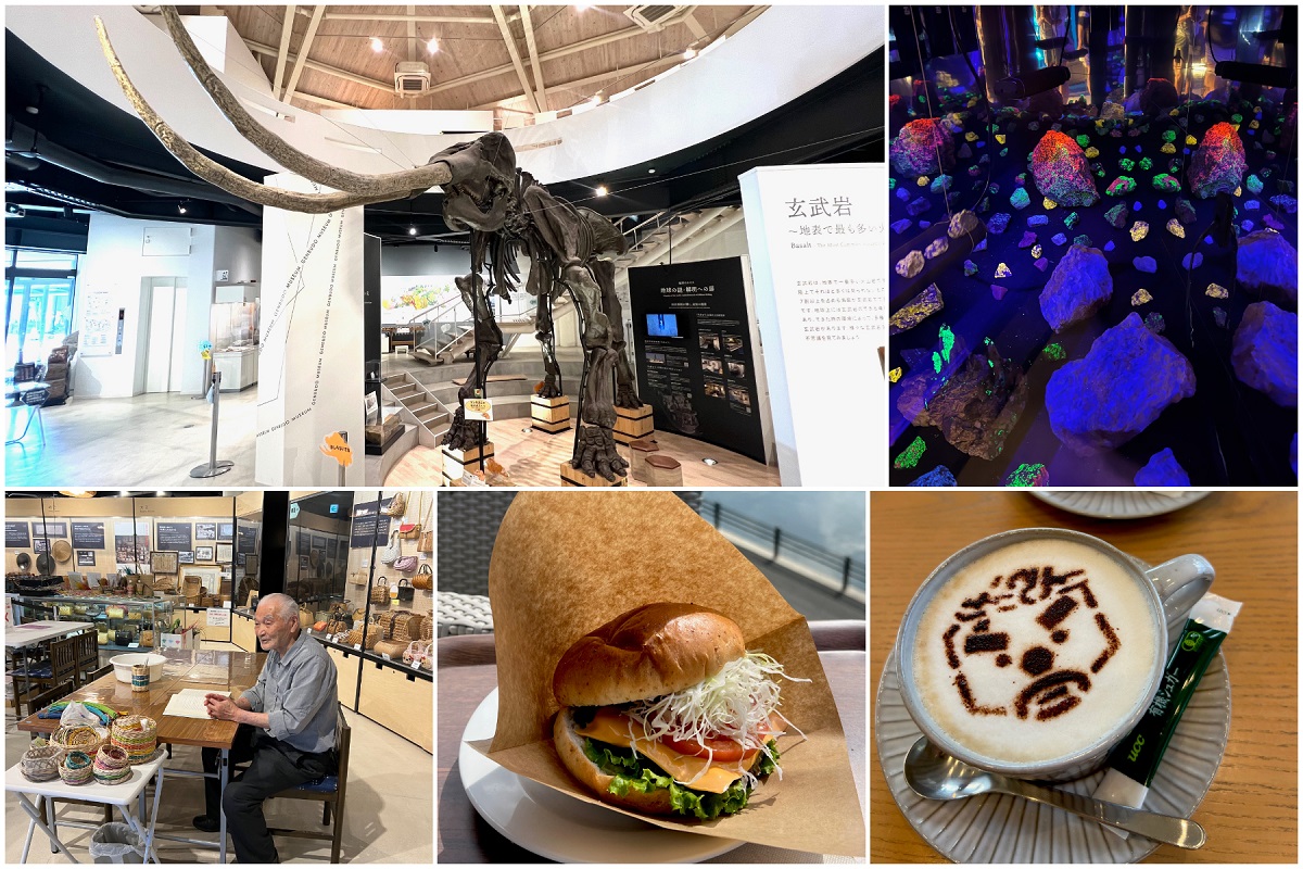 - 上/石や鉱石に魅了される「玄武洞ミュージアム」。下左/館長の田中榮一さん。下右/併設のカフェでは、但馬牛を使ったハンバーガーやユニークなカフェラテを。