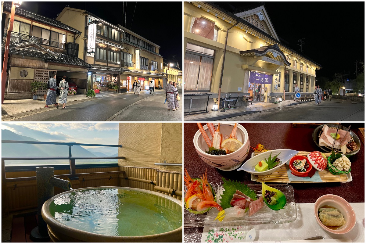 - 上/温泉街のホテルに宿泊すると、7カ所ある外湯を無料で利用できます。下/「川口屋城崎リバーサイドホテル」では、但馬の食材を取り入れた夕食を。大浴場のほか、貸切利用できる露天風呂があります。