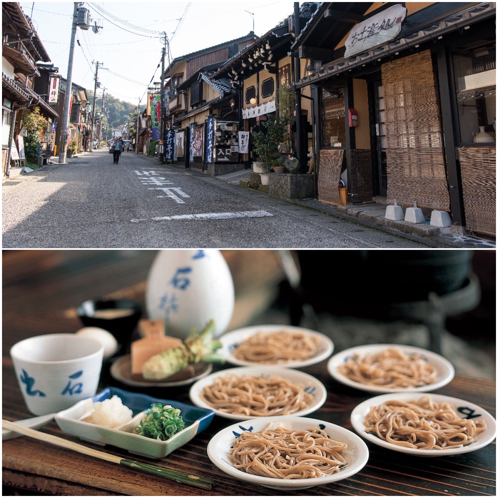 - “但馬の小京都”と呼ばれる城下町の名物が、お皿に小分けにしてに提供される「出石皿そば」。通常のメニューは5枚のそばと薬味がセットになって1人分ですが、3軒の店を巡って食べ比べができる「出石皿そば巡りセット」が観光センターで販売されています。また、町内のそば店店主からそば打ちを学び、自分で打ったそばを食す「出石でそば打ち体験」はそば通に人気です。