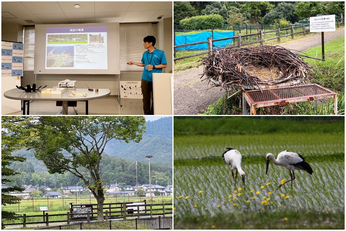 - 「野生復帰したコウノトリが教える地域環境づくり」のプログラムでは、コウノトリの生態と絶滅までの経緯、さらに繁殖と野生復帰までの歩みが紹介されたのち、屋内展示と屋外の飼育施設を見学します。コウノトリの営巣の特徴や、繁殖と飼育、放鳥までの道のりとかかわった人たちのエピソードは、映画の題材にしたくなるほどドラマチック。但馬で繁殖し日本各地に渡った個体の追跡調査の方法も、とても興味深いものでした。プログラムは5名以上のグループが対象ですが、公園施設の一部は一般公開され、ガイドウォークや餌やり体験などのイベントも行われています。