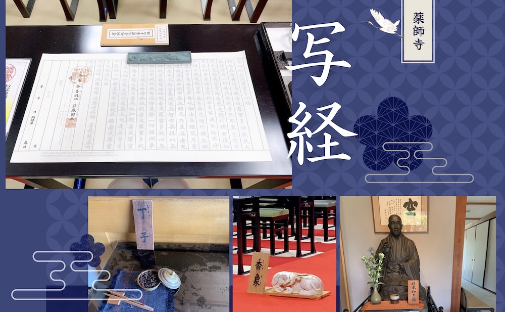 薬師寺のお写経道場では、誰でも静かにお写経に臨むことができる。受付を済ませ、香「丁子(ちょうじ)」を口に含んで身を浄め、「香象(こうぞう)」をまたいで体外を浄める。輪袈裟をかけて道場へ。合掌し「写経観念文」を一読した後、筆を取り一文字ずつ丁寧に手本をなぞる。やがて呼吸が整い、心が澄みわたっていく。お写経は、上手に書くことではなく、心を込めて書くことを重んじる行である。