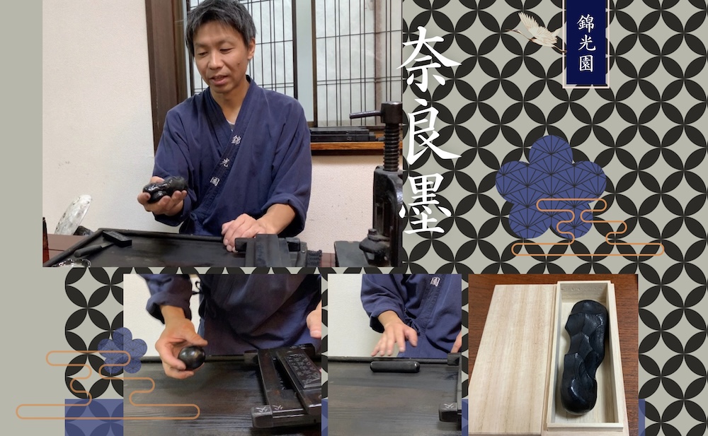 筆者が訪ねたのは、奈良市の錦光園・奈良墨工房。店内には松煙や膠、木型など製墨の道具が並び、伝統の香りが漂う。工房では墨の製造工程を見学し、自ら生の墨を握って成形する「にぎり墨体験」を行う。やわらかな墨の感触と手に残る香りから、長い年月をかけて熟成される奈良墨の奥深さが伝わってくる。