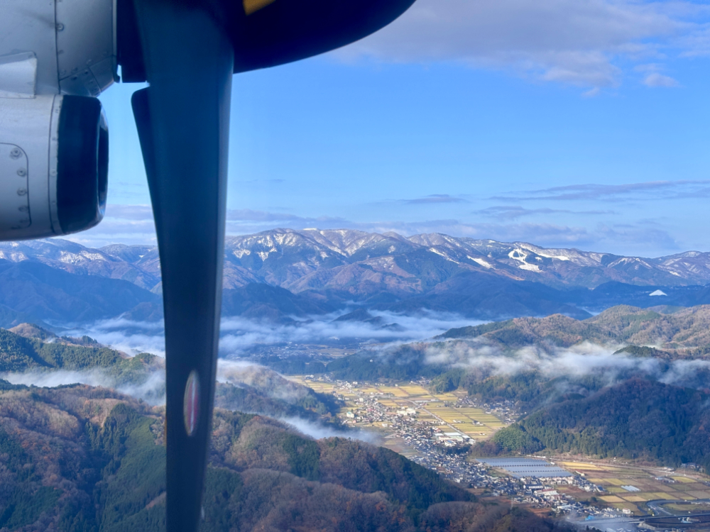 伊丹からコウノトリ但馬空港へのフライトは、低高度を飛ぶため景色が手に取るようにわかるのが魅力です。離陸後、左手には神戸の街並みや明石海峡大橋が広がり、機体はさらに西脇市や丹波市の上空を通過していきます。離陸から10数分で着陸態勢に入るのも面白い感じです。山肌に密集する雲海を見下ろすのも楽しい経験で、機体は豊岡市にある但馬空港へと高度を下げていきました。