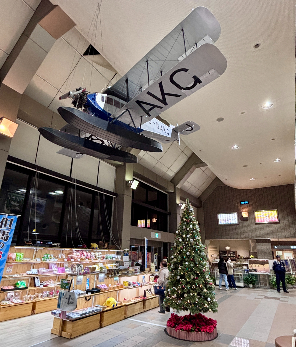 バスの出発を気にしつつも、ロビーに天井から吊るされた三菱式MC1型旅客機のレプリカを見ることが出来ました。これは1930年代に城崎を拠点に定期航空路線を運航していた日本海航空の「城崎第一号(J-BAKG)」です。