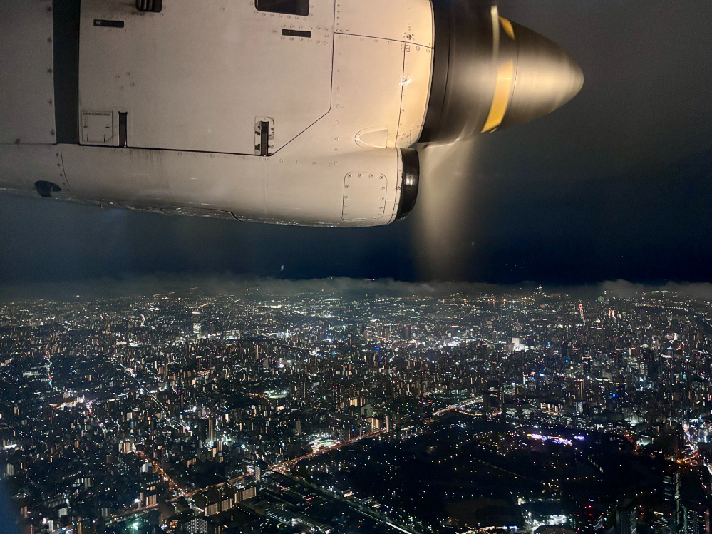 但馬からの便は、往路と航路を変えて東よりを南下します。冬の18時台は既に真っ暗な空。着陸に際し、大阪市内上空を旋回して左に回り込んで着陸するためにあべのハルカスや梅田のネオンサインが綺麗に光り、夜景見学をしているようです。最終的に30分ほど遅れて伊丹空港に到着しました。しかし、ここでも「余裕を持った乗り継ぎ設定」が功を奏しました。東京へ戻る便までは十分な時間があったため、伊丹空港のグルメを堪能することにしました。
