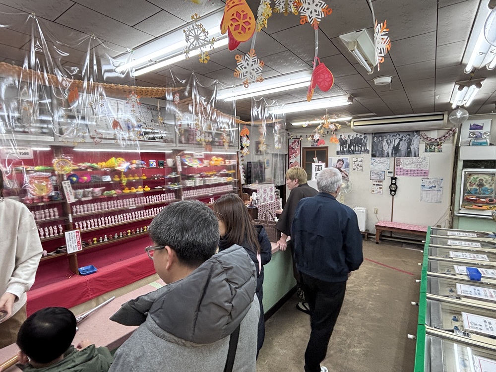 実際に「センター遊技場」で射的を楽しんでみました。500円で10発のコルク玉を求め、的を目指して打ち込みます。的の人形が落ちればカウントされ、その数によりお土産が貰えるという仕組みです。ささやかな景品のノート一冊だけでも嬉しいものです。