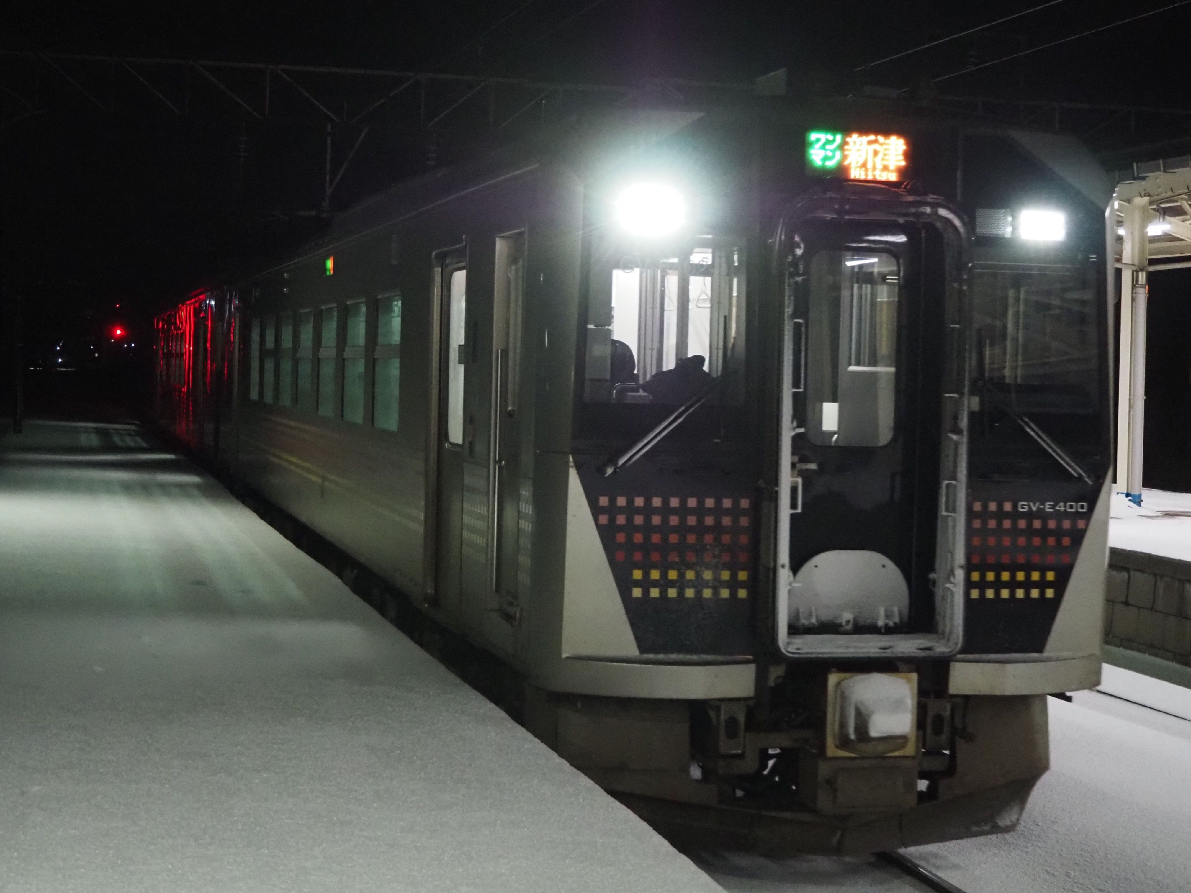 新津行きの列車が近づいていると案内があり、到着する3番線へ向かった。遠くで左右両方の上部にある白いヘッドライトが点灯しているのが見えてくると、徐々にその姿を現してきた。ディーゼルエンジンと発電機による電力でモーターを駆動させて走る電気式気動車GV-E400系だ。