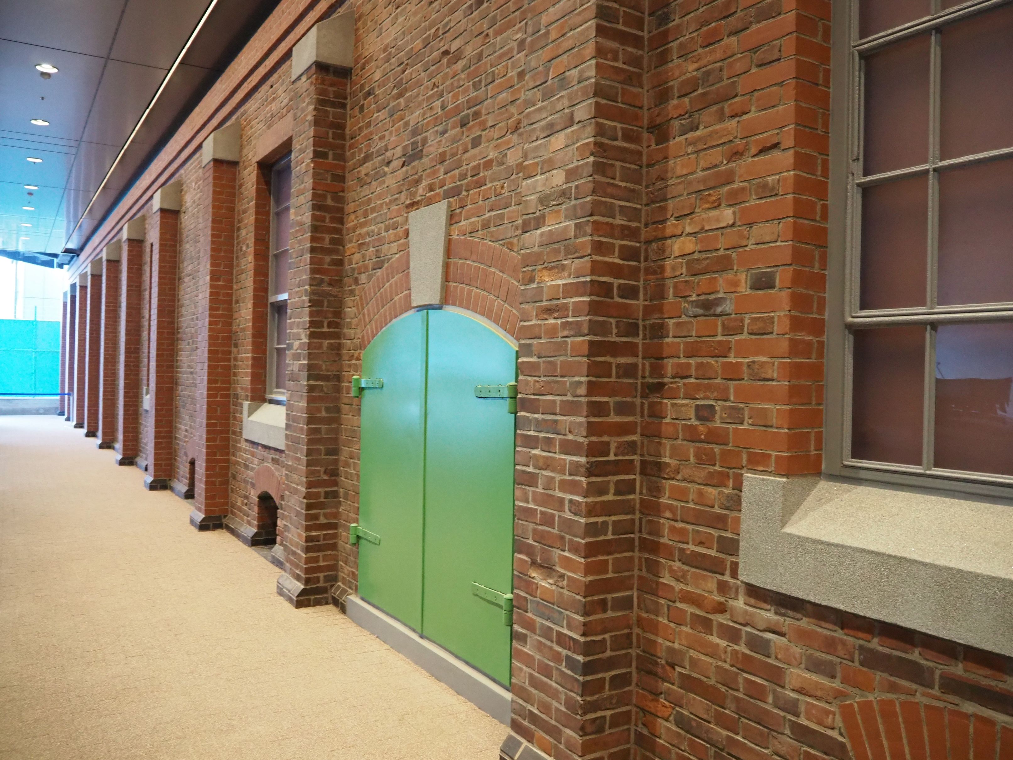 「レンガ車庫」こと御料車庫に使っていたレンガの一部は、バスなどが乗り入れられる「交通広場」に面したビジネスタワー1階の壁に活用されている。