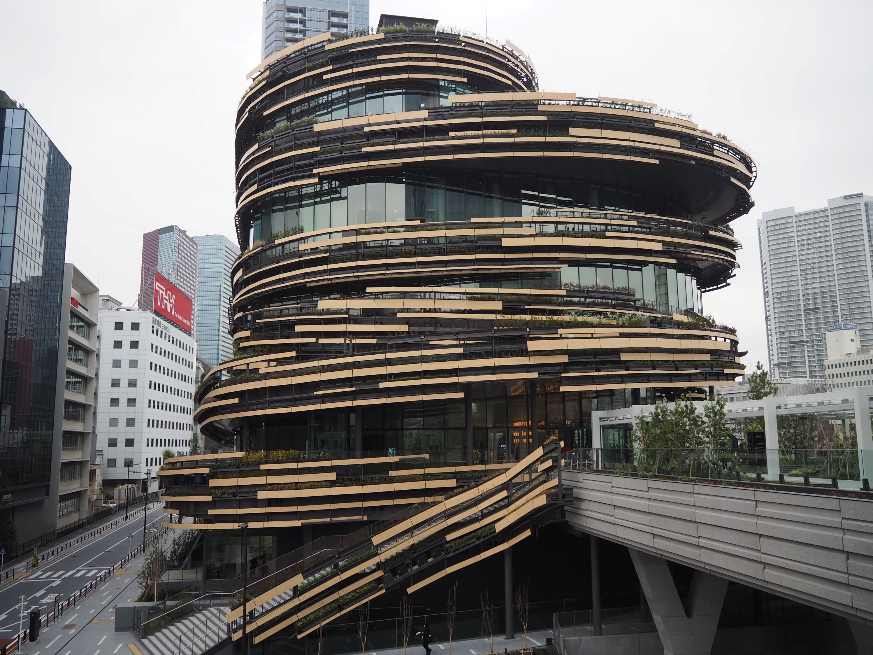 リンクピラー2と賃貸住宅の間には、都会のオアシスと呼ぶべき“緑の回廊”が設けられた。6階建て、地下3階建てのらせん状の建物で、延べ床面積が約2万9000平方メートルの「モン タカナワ」だ。伝統や漫画、音楽、宇宙など境界を越えたテーマを扱う「文化の実験的ミュージアム」と位置づけている。
