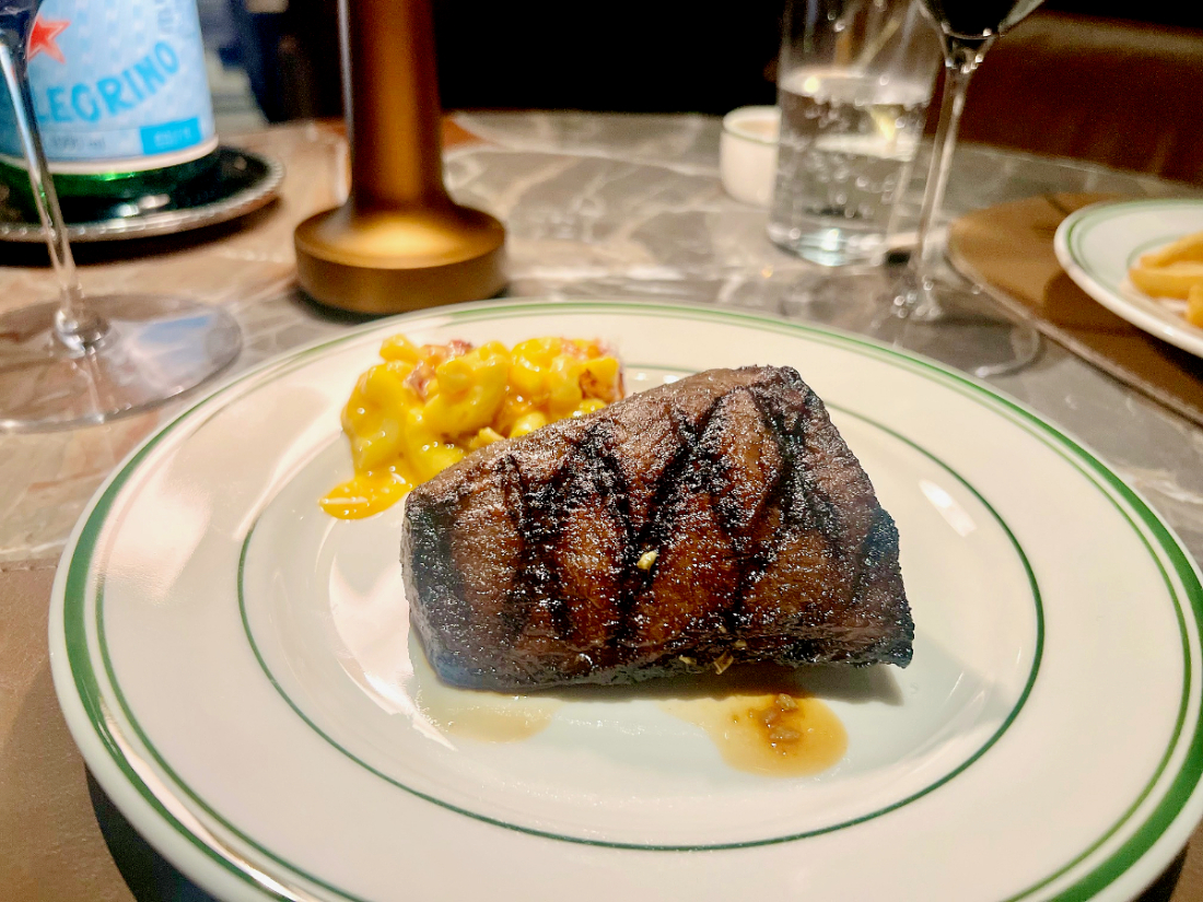 zoomこの日は、アミューズ・前菜・ビスク(スープ)・ステーキ&デザートの「5 Course」。前菜には「赤海老のカルパッチョ・旨みドレッシング・九条ネギ」をチョイス。濃厚な甘みとねっとりとした食感が持ち味の赤海老を、爽やかな辛みをもつ九条ネギがきりっと引き締めています。オレンジ色が目に鮮やかな「自家製ビスク」には、海老の旨みがたっぷり。メインのステーキは、「千葉県産ビーフのテンダーロイン」を選びました。ステーキのサイドディッシュには、マッシュポテト、ベイクドポテト、ローストカリフラワー、フレンチフライなどのメニューが並びます。その中から、“これぞ、アメリカ!”という一品「マック&チーズ・カルボナーラ風」に決定です。
