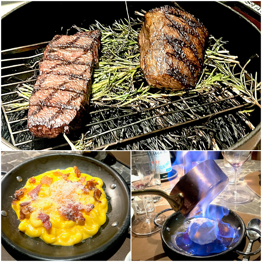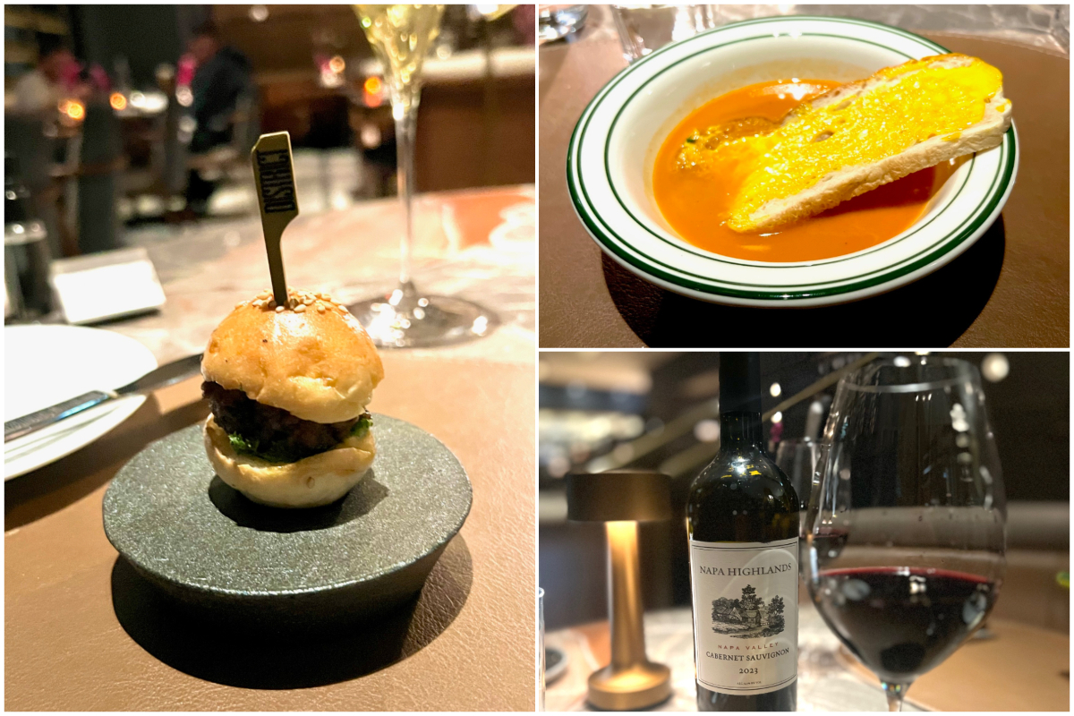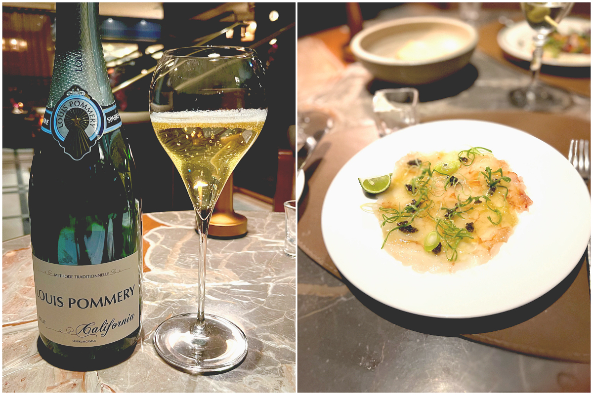 スパークリングは、「LOUIS POMMERY CALIFORNIA BRUIT」。シャンパーニュメゾン「ポメリー」の監修によりカリフォルニアで造られた辛口スパークリングです。赤ワインの「NAPA HIGHLANDS CABERNET SAUVIGNON」は、果実味があり滑らかな口当たり。しっかりとしたタンニンが、藁とハーブでスモークしたステーキにぴったりでした。