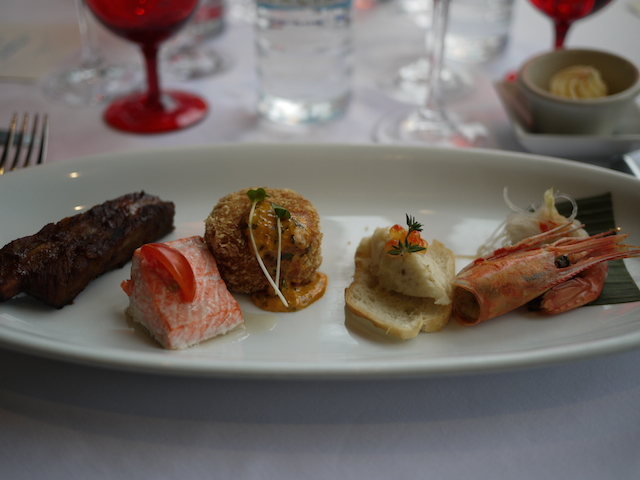 前菜は左から時計回りにベビーポークリブ、アラスカ産タラバガニのクラブケーキ、ボタンエビのエスニックカクテル、子持ちカレイのリエット、アラスカサーモンの炙り グレープフルーツと塩麹ドレッシングの5品。(下線がアラスカ産)サーモンは身がしまっていて素材の味や香、タラバガニのクラブケーキはほんのりと上品な蟹の甘さが感じられる。天然物は余分な脂がなく素材の香りが強いと田崎氏。前菜に合わせたワインはほんのりスパイシーでトマトやサーモンに合わせやすいカリフォルニア産の本格派ロゼ「シュラムスバーグ・ブリュット・ロゼ2009」。ワインは食材の色味と合わせると良いそうだ。