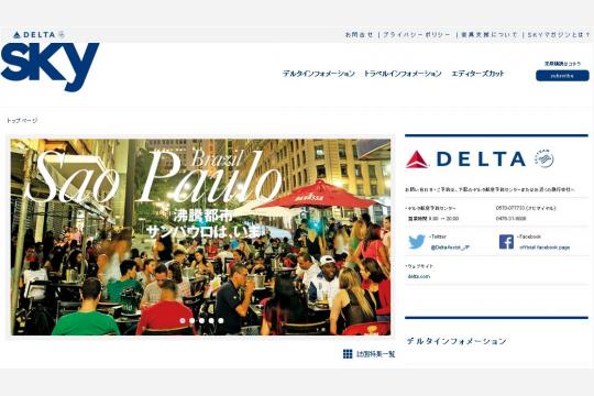隔月発行の日本語機内誌スカイマガジンは、旅をコンセプトにしたライフスタイルマガジンです。旅、ビジネス、エンターテインメント、ファッション、トレンド分野の読み物に加えて、機内サービスや空港のターミナル情報など、渡航に際して役立つ情報を日本語でお届けしています。日本発着路線のデルタ航空全便に搭載されているほか、空港ラウンジ等で無料配布しています。機内誌ウェブサイトでは、特集記事のダイジェスト版やインタビュー記事を掲載しているほか、機内食や機内エンターテインメント情報、誌面に掲載しきれなかった写真を集めたギャラリー、編集部の取材秘話を集めた「エディターズノート」などをご紹介しています。http://www.deltasky.jp/