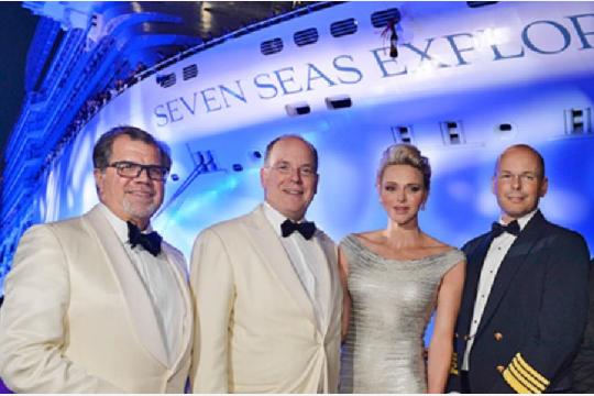セブンシーズ・エクスプローラーのゴッドマザー、モナコ大公妃シャルレーヌ殿下が赤いベルベットのリボンにはさみを入れると、船体にヴーヴ・クリコ、プリマ・ボトルのシャンパン洗礼を受け、この史上最も豪華な客船はリージェント・セブンシーズ・クルーズの正式な一員として命を受けました。