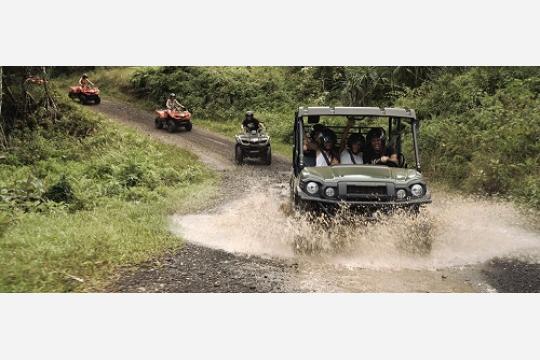 クアロアランチの人気アクティビティのひとつ、四輪バギーツアー。広大な敷地を走り回るのは本当に爽快!! しかし残念ながら、参加資格は16歳以上。2人乗りは禁止されている。お子様が年齢に達していないため、または同行者が運転が出来ない等の理由で、同じグループで、別々のパッケージを購入されていたお客様も多いはず。このKawasaki Mule-FXT (愛称:ラプター/Raptor)は5人まで乗れるので、ご家族やカップル、友達同士で同じエキサイティングな体験ができ、また、他のツアーにも一緒に参加できる。送迎つきなのも魅力。