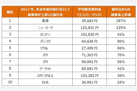 カヤックは、旅行サイト各社を一括検索することで、航空券、ホテル、レンタカーの情報を比較検索し提供する旅行検索エンジ。KAYAK.co.jpのデータに基づき、今年の年末年始(12月20日~1月5日)の旅行先として検索率が急上昇した都市の第1位は香港。ニューヨークやロンドンなどの長距離のデスティネーションもランクインしている。