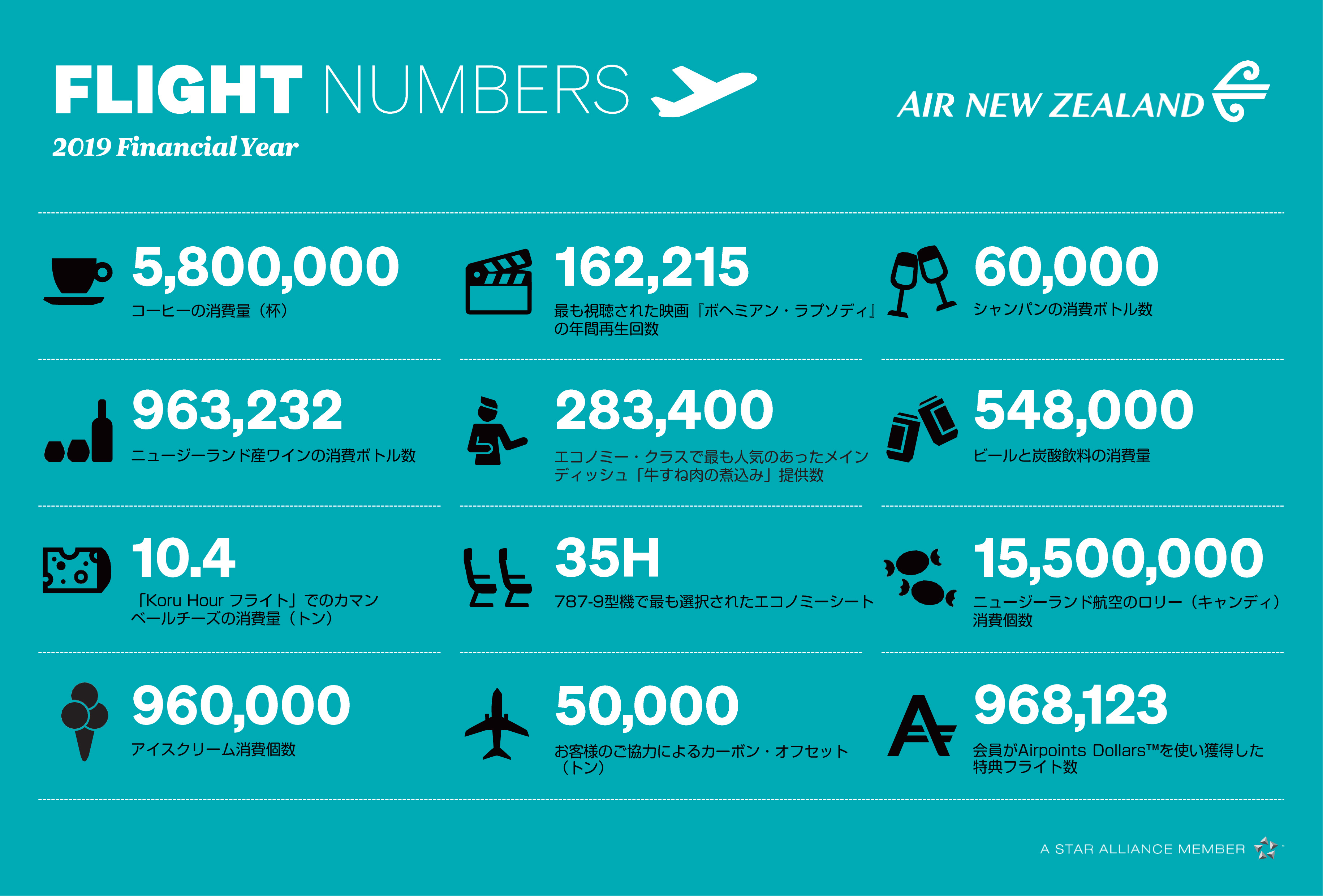 今回の発表は、2019年度(2018年7月~2019年6月)におけるニュージーランド航空の顧客行動分析データから収集された結果の一部であり、データはカーボンおよびWi-Fi接続から、お客様のお気に入りのお飲み物、お食事まで、あらゆる側面から機内を紐解いています。