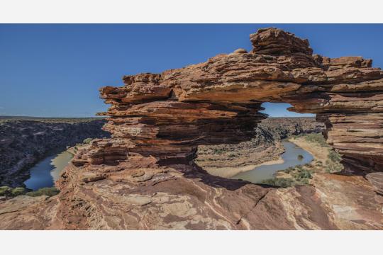 ピナクルズから北へ約370kmに位置するカルバリー国立公園は、内陸から約600kmを経てインド洋へ注ぐマーチソン川の侵食により形成された壮大な渓谷。赤い地層がむき出しになった峡谷やブッシュが生い茂る大地など、ダイナミックな景観が広がる。岩に縁取られた自然の窓ネイチャーズウィンドウ(ザ・ループ)から眺めるマーチソン川と遥かに広がる赤い大地は迫力満点。7月から11月にはゴツゴツとした赤い大地に約800種類のワイルドフラワーが咲く。カルバリー国立公園へのアクセスは、パースからジェラルトンまで空路で約1時間、ジェラルトンから車で約2時間、パースから車で約6時間。