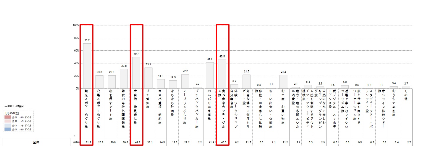 これまでの旅の目的は「観光スポットめぐり旅」がトップであったが、「これから行きたい旅の目的、スタンスのなかで近いと思うテーマを教えてください」(5つまで選択可能)の設問では、「大自然・絶景癒し旅」(54.5%)が5%上昇して最大。「のんびり温泉宿旅」(51.0%)は10%上昇、「プチ贅沢旅」(49.2%)が16%と急上昇。ほかにも「穴場スポットめぐり旅」(29.1%)が9%上昇。これまでの旅では0.5%と関心の低かった「移住・田舎暮らし体験」は10倍の5.1%に上昇した。一方「観光スポットめぐり旅」が30.4%と41%下降した。