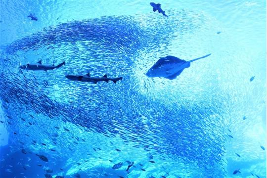大水槽「いのちきらめくうみ」は、豊かな三陸の海を再現しており、マイワシやホシエイなど50種3万点の生きものたちを飼育展示。幅14m、水深7.5mのスケールを誇る水槽は、屋根がなく、太陽光がそのまま降りそそぐ造りで、生きものたち本来の色鮮やかな姿を演出している。