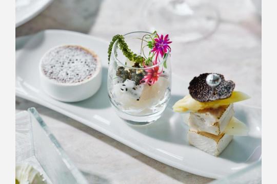 ・フォアグラ、ホワイトセサミと黒糖のクレームブリュレ