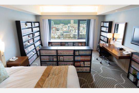 ホテルオークラ神戸では、近年の漫画ブームに注目し、思いっきり漫画の世界に浸ってリフレッシュしてもらいたいという思いからこの企画を実施。新たに誕生した「MANGA ROOM」は、ベッドからも漫画本を手にとりやすいように配置した本棚に、話題の作品から歴代の名作を中心に多様なジャンルの作品約3,000冊(約100タイトル)を揃えており、滞在中に自分のペースで読みたいだけ読むことができる。