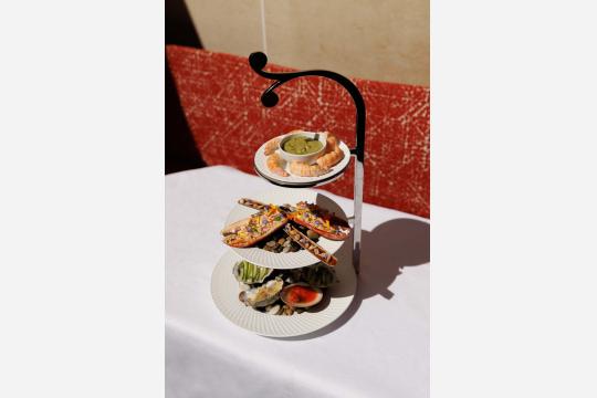 今年のラ・テラス・モンテーニュのためにシェフ・ジャン・アンベールが考案したメニューは、シャンパンとのペアリングにも理想的な牡蠣とシーフードが主役。ロブスターの爪とキャビア、そば粉風味のキャップフェレのタラマ、コーラルソースを使った蟹のケーキ、ラングスティーヌの生春巻きも見逃せません。