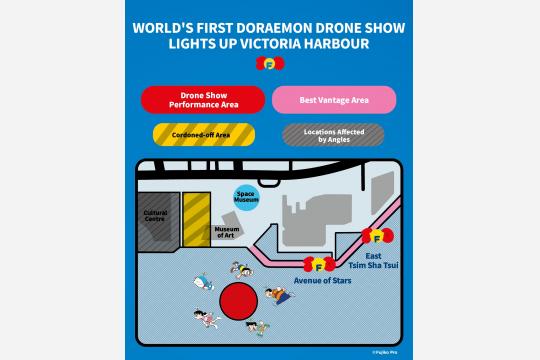 7月のイベントの開催を記念して、5月25日香港時間19時30分には世界初となるドラえもんのドローンショーが香港のビクトリアハーバーで開催され、美しい夜空にドラえもんと仲間たちが登場します。