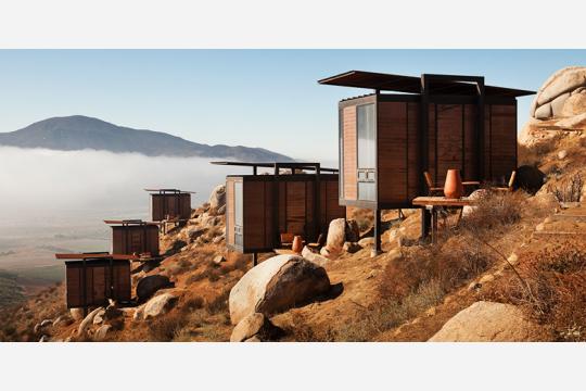 サンディエゴから車でほんの1時間半。「ホテル・エンデミコ」の超モダンな“エコロフト”は、外からだと岩石が点在する乾燥地帯を見下ろすシンプルな木造ボックスにしか見えないけれど、一歩中に入れば、白、黒、コンクリートグレーを基調としたスタイリッシュな空間が広がり、床から天井まである窓からは遠くの山岳やその麓に広がる大きな田園地帯を眺めることができます。