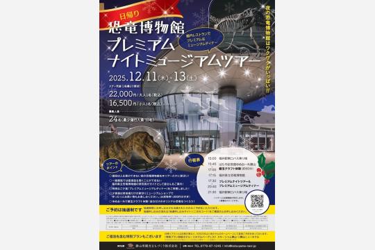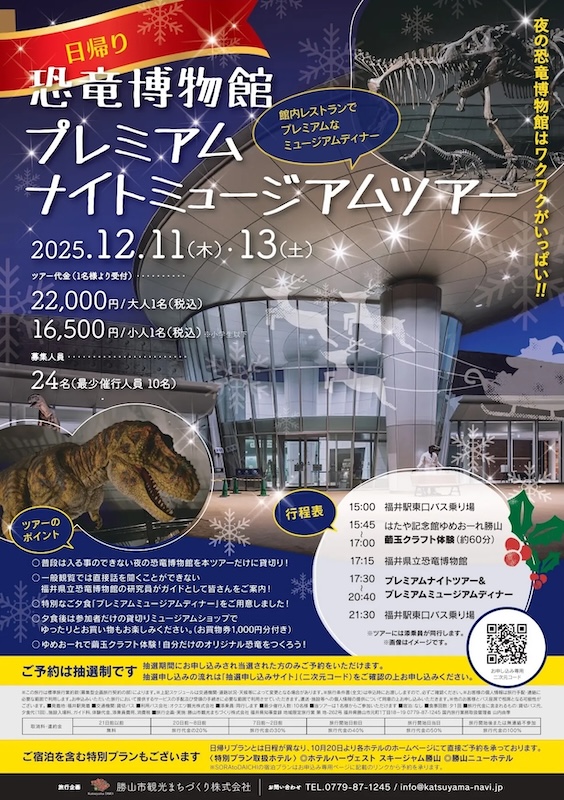 勝山市観光まちづくり(勝山DMO)は、福井県立恐竜博物館における夜間特別ツアー「恐竜博物館プレミアムナイトミュージアムツアー」を2025年12月11日(木)から12月14日(日)までの計4日間にわたり実施する。福井県立恐竜博物館でのナイトツアーは今回で3回目。今回は初めて地元の勝山DMOと恐竜博物館がタッグを組んでツアー企画で、日帰りプランと宿泊プランがある。