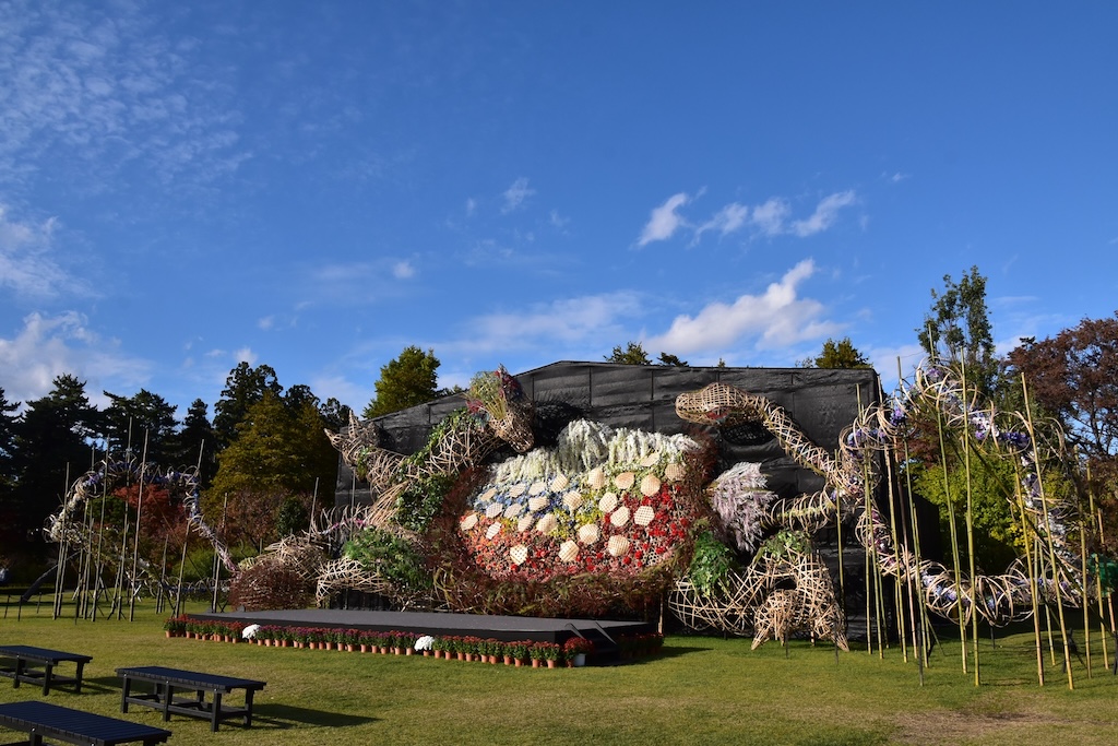 丸い菊の花ピンポンマムをモチーフにした毛糸でできた「ぽんぽんマム」が三の丸庭園を敷き詰め。