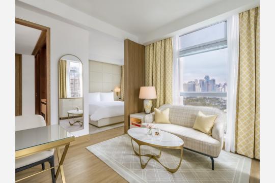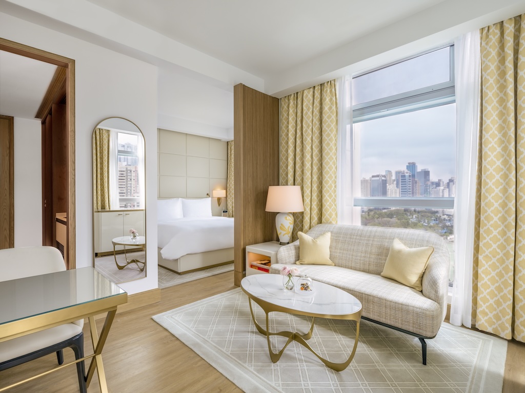 188室の客室は、天井までの窓から自然光に包まれるパステルトーンを基調にしたモダン・クラシックなインテリア。客室の半数は、長期滞在にも好評なスィート・タイプで、85~180㎡のペントハウスも数室ある。このため、ホテルというより、ラグジュアリーなレジデンスのような落ち着いた雰囲気だ。24時間のランドリーやジムも完備。