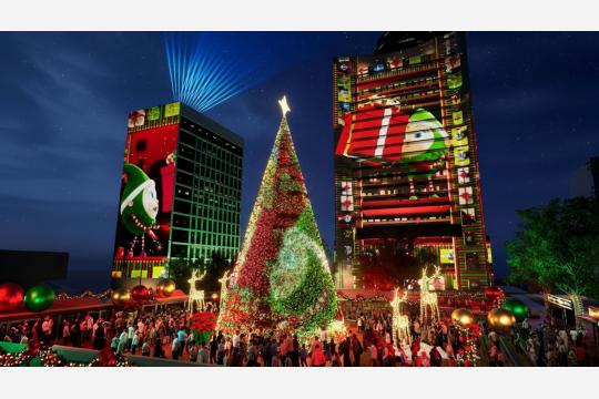 3Dプロジェクションマッピング、照明効果、ホリデーソングを組み合わせ、トナカイや