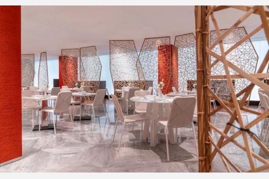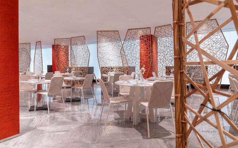 今回の大規模改装では、全137室の客室とスイートをイタリア人デザイナー、パオラ・ナヴォーネが刷新。木材や石材、陶器といったナチュラル素材をベースに、タイの伝統色でもある僧衣のオレンジをアクセントに取り入れた落ち着きと温かみのあるデザインに仕上がった。ロビーの石材カウンターや竹を模した壁面など、ホテル全体に“タイ文化の息づかい”が感じられ、バンコクの洗練と伝統を同時に体験できる空間となっている。