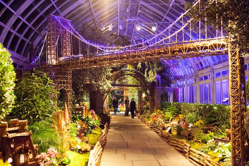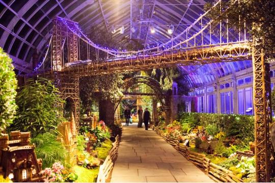 続いて紹介するのは、34年目を迎えるニューヨーク植物園の「ホリデー・トレイン・ショー」(https://www.nybg.org/event/holiday-train-show-2025/)。イーニッド・A・ハウプト温室には、自然素材で精巧に作られた約200ものランドマーク模型が並び、その間を模型列車が走り抜ける。夜になるとライトアップされた山岳風景が浮かび上がり、幻想的な「ホリデー・トレイン・ナイツ」で昼間とは違った表情を楽しめる。家族連れにも人気のイベント。