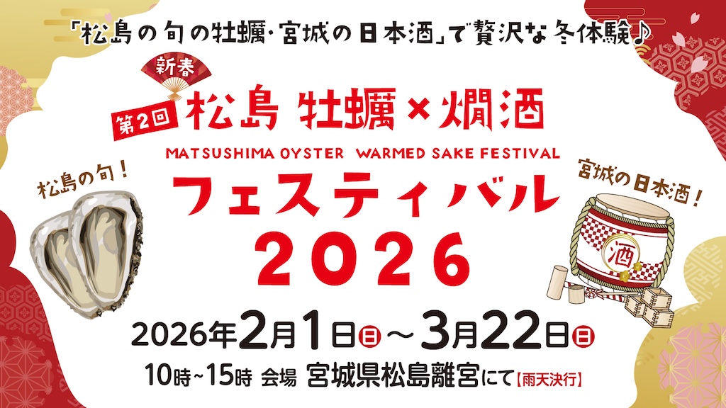 宮城県松島町の松島離宮で、2月1日から3月22日まで「松島 牡蠣×燗酒フェスティバル」が開催される。旬を迎える松島産牡蠣と宮城県の日本酒を燗酒で味わう冬季限定のイベントで、食を軸にした冬の松島観光の魅力発信を目的としている。