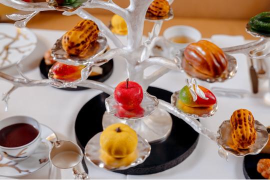 続くコースでは、セドリック・グロレのシグネチャーである「トロンプルイユ(だまし絵)」の技法による、季節のフルーツ6種をご提供。開始時には、柚子、旬のりんご、マンゴー、ピーナッツ、ピスタチオ、ピーカンナッツがラインナップされます。また、サービス中を通して、温かいマドレーヌやケーキ、シュガーブリオッシュ、焼きたてのスコーンも随時お楽しみいただけます。