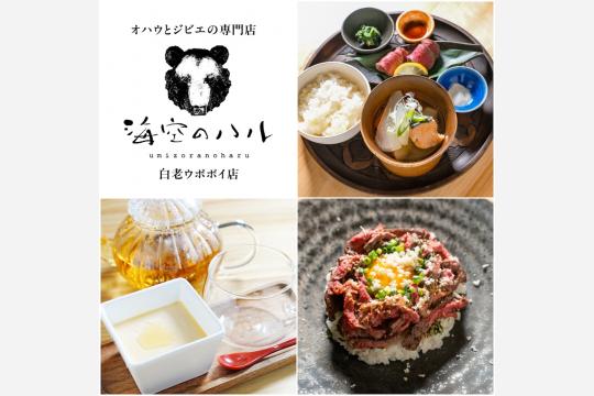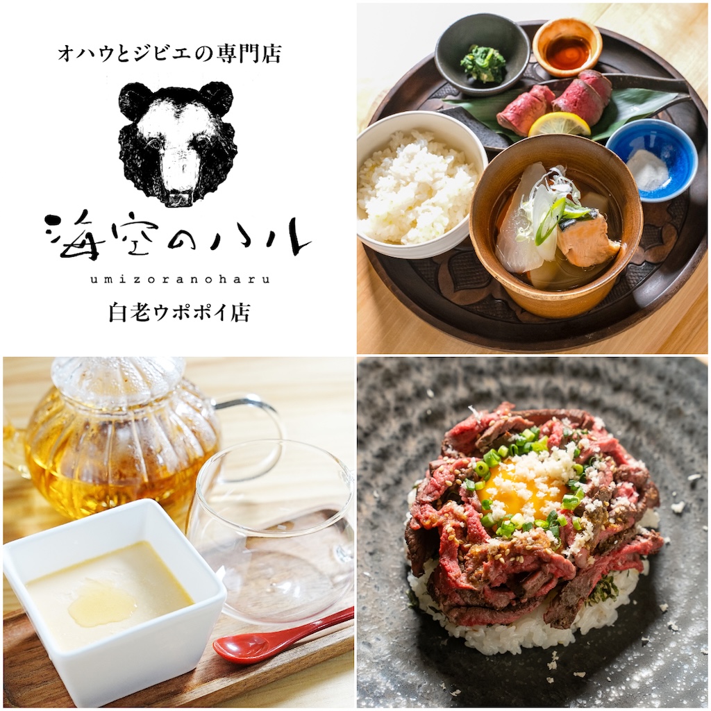 4月3日にオープンするのは、レストラン「オハウとジビエの専門店 海空のハル」。アイヌ文化においてアイヌ語で汁物を意味する「オハウ」を軸に据えたメニュー構成が特徴で、白老町出身のフチ(おばあさん)が作る伝統料理のオハウをはじめ、北海道ジビエ(鹿肉・熊肉)を使った日替わり定食や軽食、スイーツを提供する。また、こだわりの珈琲や北海道のワイン、アイヌ語でシソ科のナギナタコウジュを指す「エント」を使った茶やプリンなどのオリジナルメニューも用意されている。