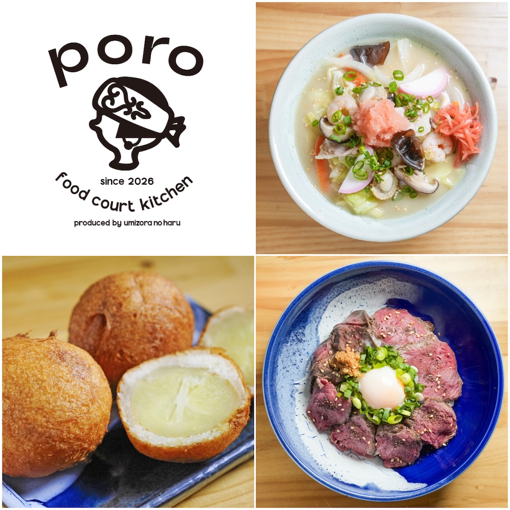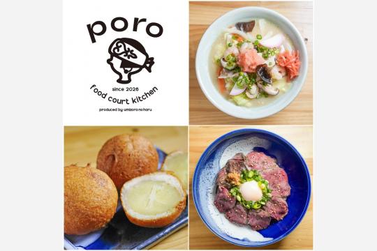 4月28日にオープンするフードコート「フードコートキッチン poro」は、地元食材を使った96席の大型フードコートとして展開される。しらおいちゃんぽんや白老牛カレー、ポロト豚丼、えぞ鹿丼のほか、北海道のソウルフードとも言われるあげいも、アイヌ語でよもぎを意味する「ノヤ」を使ったソフトクリームなどのテイクアウトメニューも充実する構成となっている。営業時間は9時から閉園時間まで(ラストオーダーは閉店1時間前)。