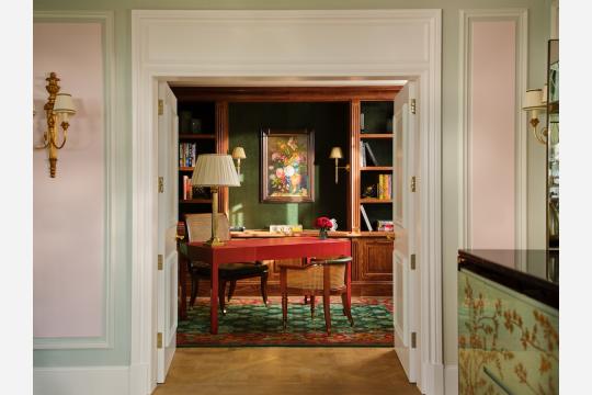 さらに、独立した書斎も備え、マホガニーの本棚やティスランの照明が配されたクラシックな空間に、中国風の赤いラッカーデスクと籐のアームチェアがアクセントを添えています。