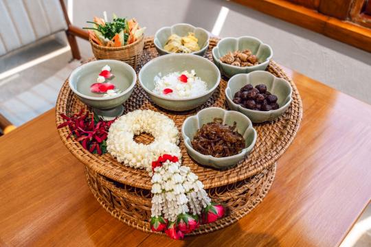 4月13日には、朝の托鉢から新年が始まり、季節の料理「カオチェー」が振る舞われます。午後には、ソンクラーンの女神「ナーン・ソンクラーン」に着想を得た水のパレードが行われ、新たな始まりと再生を象徴します。また、仏像に水を注ぐことで浄化を表す「ソンクラーン・ナム・プラ」や、年長者の手に香り水を注ぎ祝福を受ける「ロット・ナム・ダム・フア」など、伝統的な儀式も体験いただけます。一日の締めくくりには、タイ古典舞踊や仮面劇「コーン」のパフォーマンスとともに、優雅なBBQディナーをご用意しています。