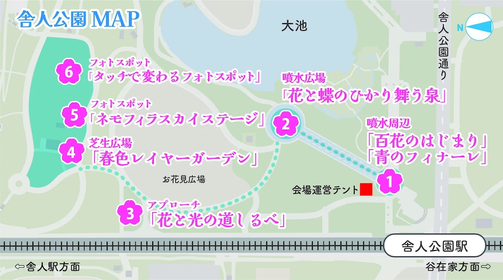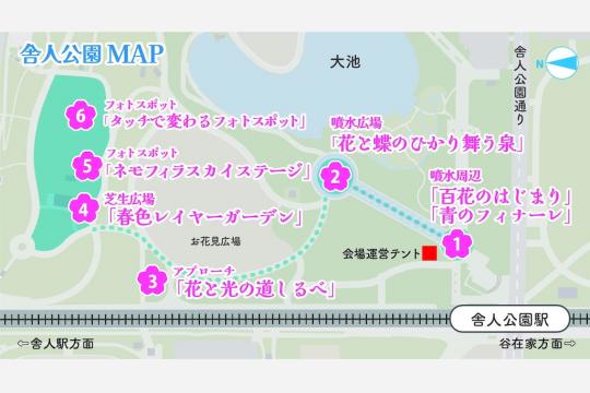 「花と光のムーブメント」は、東京都が四季を通じた花と光の演出によって公園の新しい活用のあり方を提案するかたちで展開しているイベントシリーズで、舎人公園での春季開催はその一環で、会場内には複数の鑑賞・体験エリアが設けられる。
